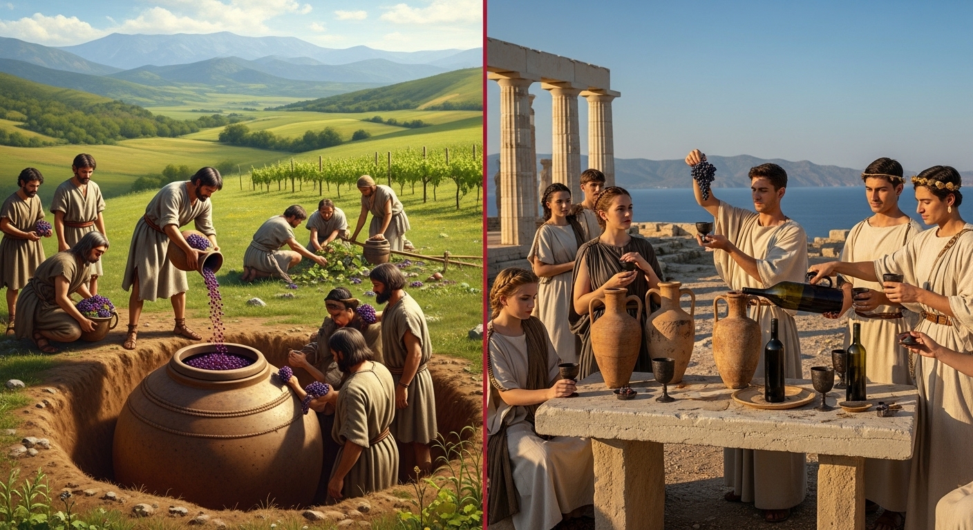 ワインの歴史はおよそ8000年前に遡ります。考古学的発見によると、現在のジョージアやアルメニアの地域でブドウを発酵させた痕跡が見つかっており、ジョージアは「ワイン発祥の地」とも呼ばれています。この地でのワイン造りは伝統として受け継がれ、今日でもクヴェヴリと呼ばれる土壺を使った醸造法が残っています。古代メソポタミアやエジプトでもワインは宗教儀式や王族の飲み物として用いられ、文明の発展と共に広がっていきました。